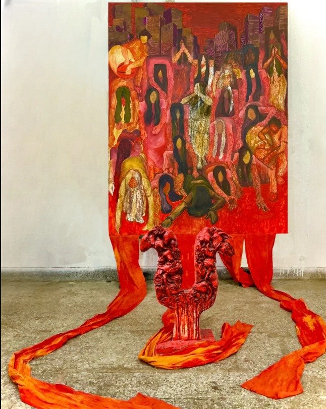 SACRIFICE Representing my personal memories, of a ritual of my own village.From the childhood, I witnessed the layers of meaning behind that annual gatherings. My visual memory of the ritual was that of a mesmerized infant—fascinated, confused, and silent. The painting is a snapshot of changing moment of the ritual known as ‘Dondi’, offering devotion through a collective endurance and physically intense act—lying down, marking the ground with their hands, rising, and repeating that rhythmic, flowing, almost dance-like movment. Contrasting their struggle and sacrifice. After that animals being sacrificed in the name of God.This installation brings together two mediums—painting and sculpture as a metaphor to mirror the contradiction . The painting represents the mesmerizing unity of bodies in motion, the strength and vulnerability of the women, the beauty in their spiritual offering. The sculpture, on the other hand, confronts the viewer with the twisted, flowing forms suggesting movement but also agony, layered with silent faces. Both pieces are born from a memory. They do not oppose each other, but exist in tension.